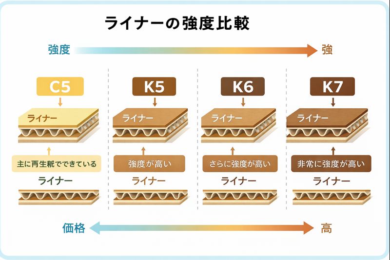 ライナーや中芯の材質・厚みなどの内部構造まで意識すると、同じ規格のダンボールでも