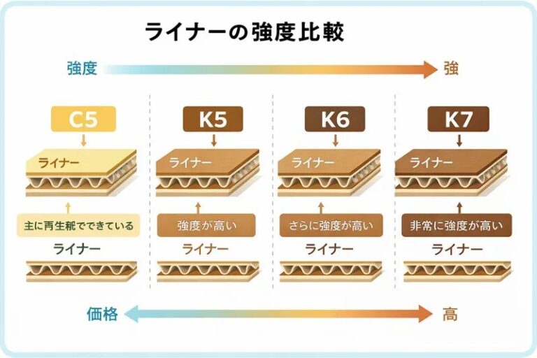 ライナーや中芯の材質・厚みなどの内部構造まで意識すると、同じ規格のダンボールでも